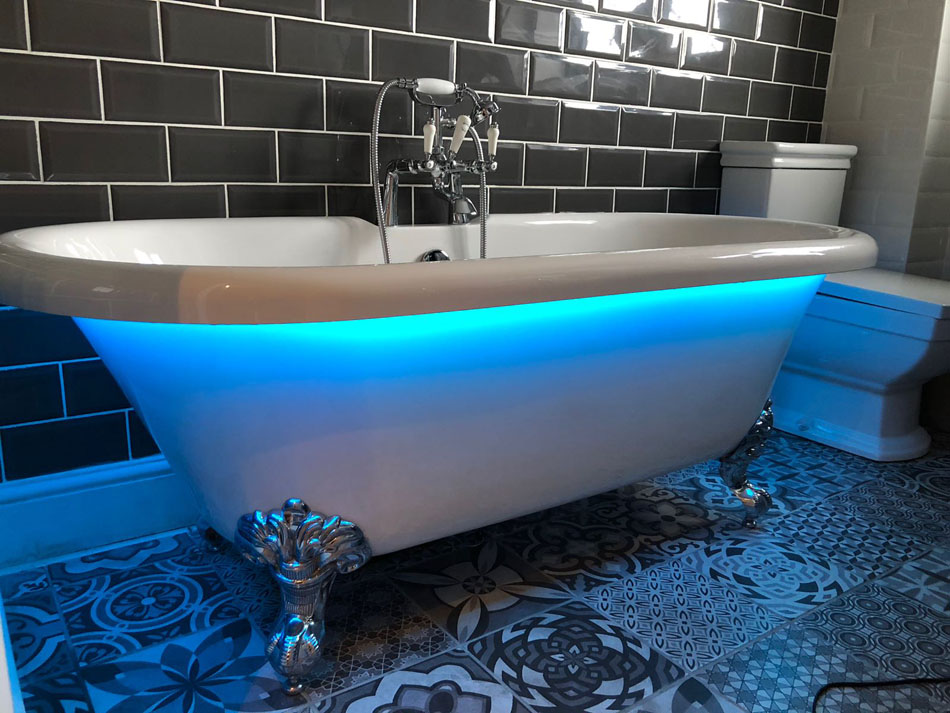 Hidden RGBW LED tapes run around the overhanging lip of this traditional bathtub.