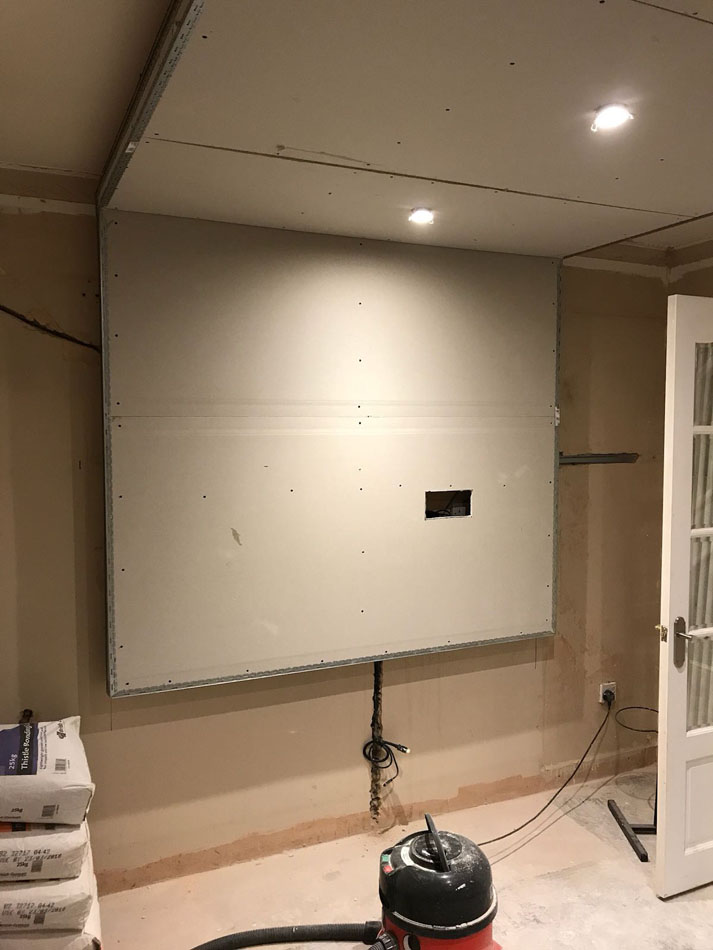 These pictures of the front room’s renovation show the end-to-end construction of a lowered ‘false ceiling’ and the installation of LED strip lights.