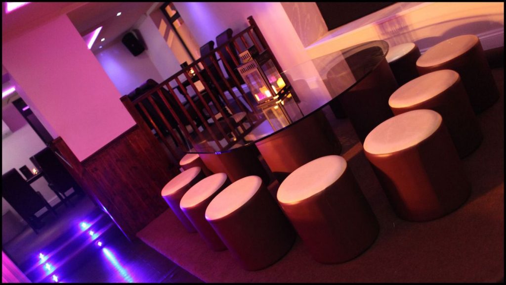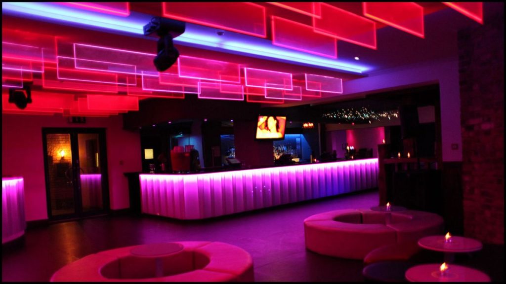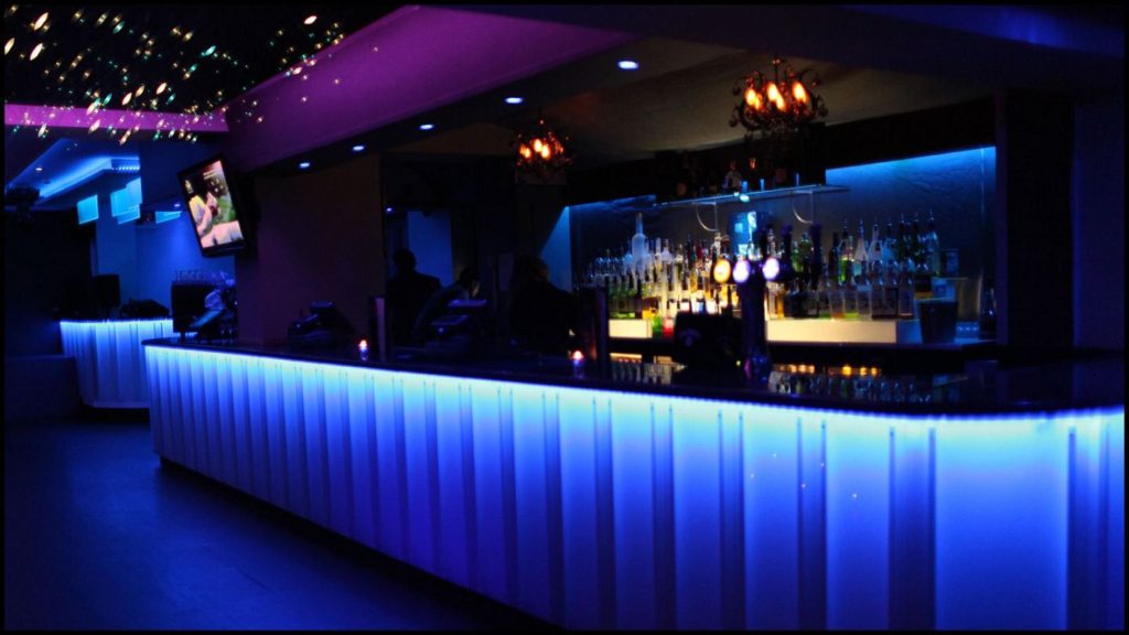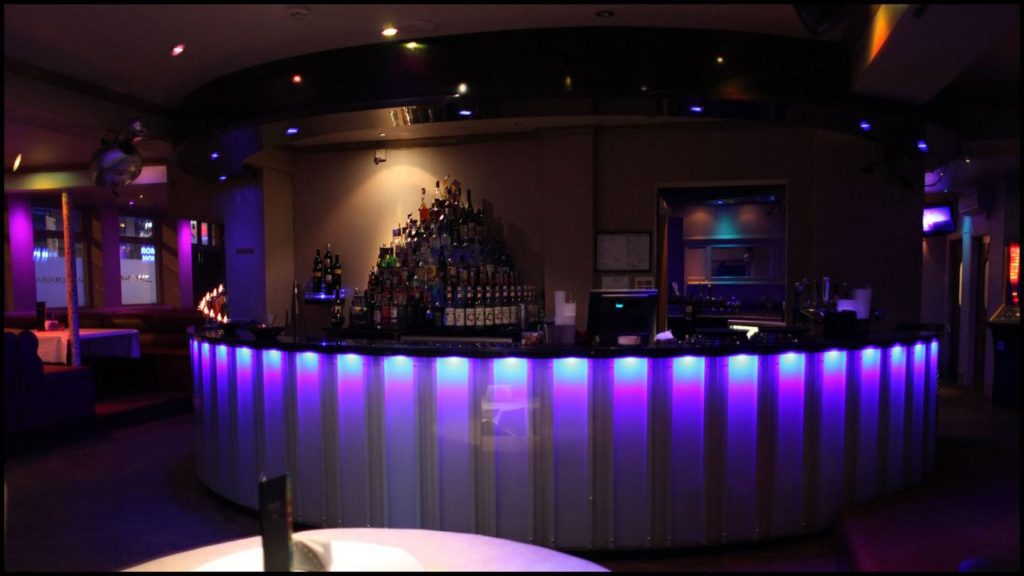 Colour changing RGB LED Tape has been installed along and around the bar area and seating area and RGB Downlights have been installed into the ceiling around the bar/restaurant/club.