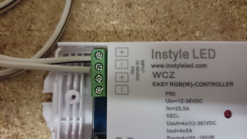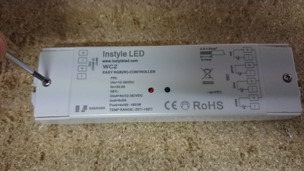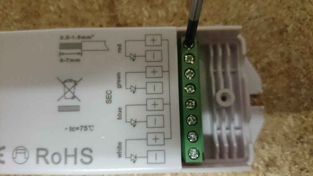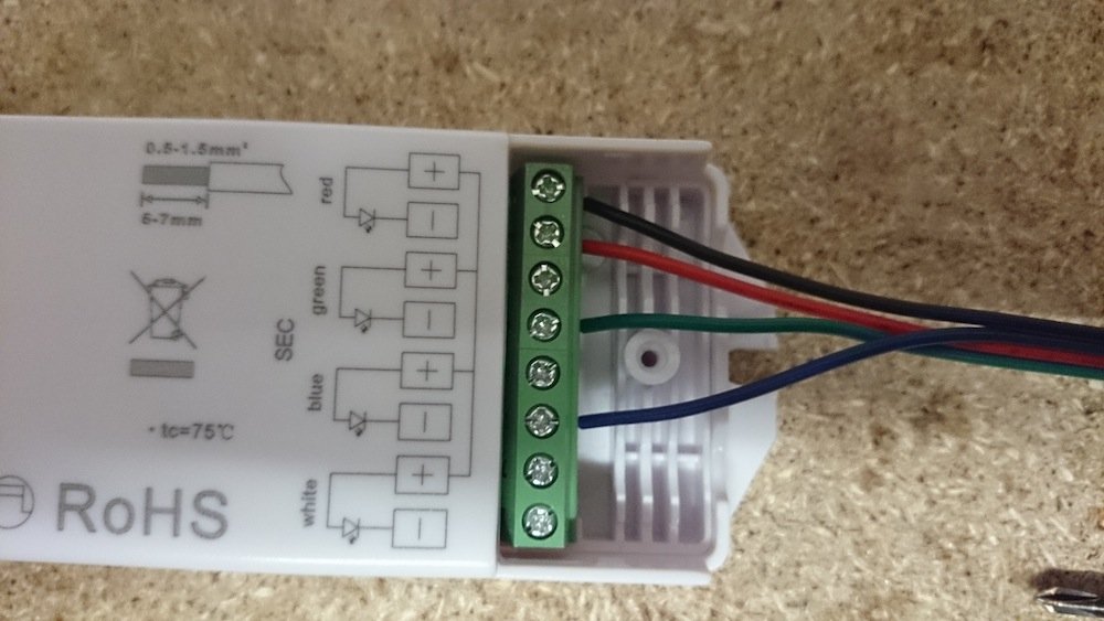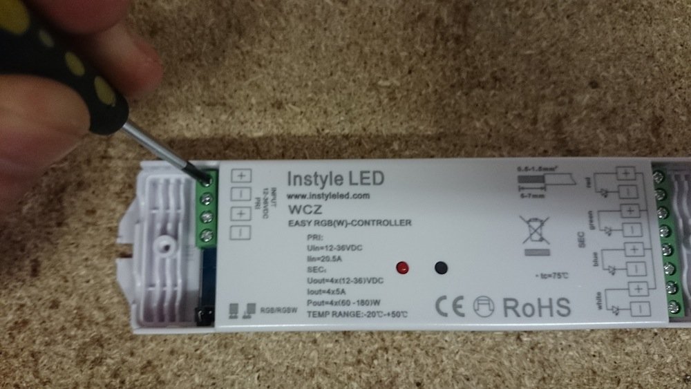 4. On the right hand side unscrew the + and on the Red channel, and then the on Green and Blue. In the Red channel place the Black cable in the + connection and the Red wire in the connection. In the Green channel place the Green cable into the connection, In the Blue channel place the Blue cable into the connection.