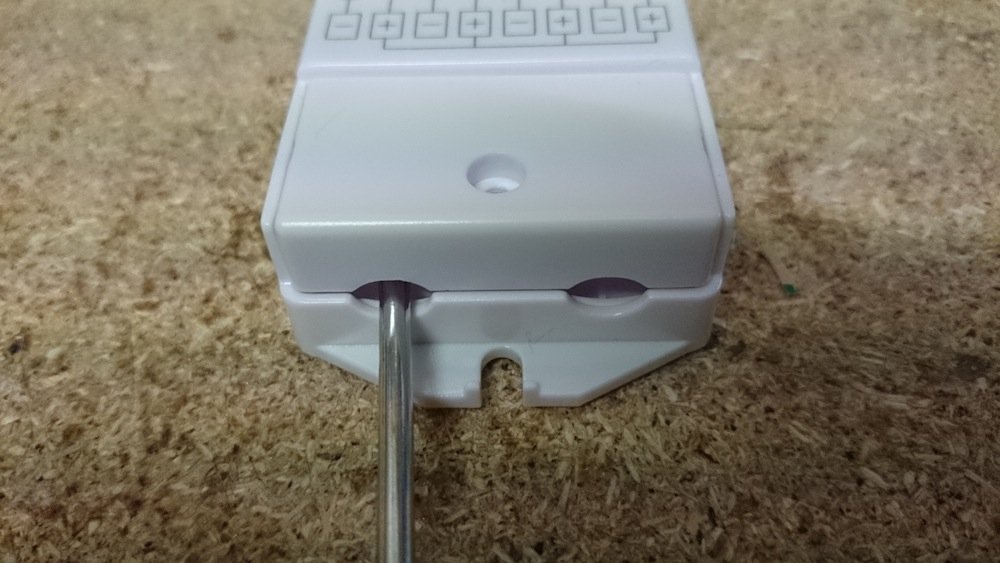 2. Now unscrew the two screws which are holding down the plastic lids. Once the screws have been taken out use the flat headed screwdriver to take off the lids by placing the head into the small gaps on the sides (see photo below). Repeat this on the other side as well so both lids have been taken off.