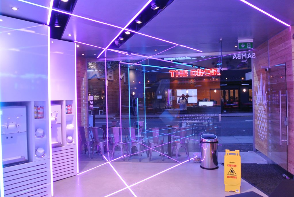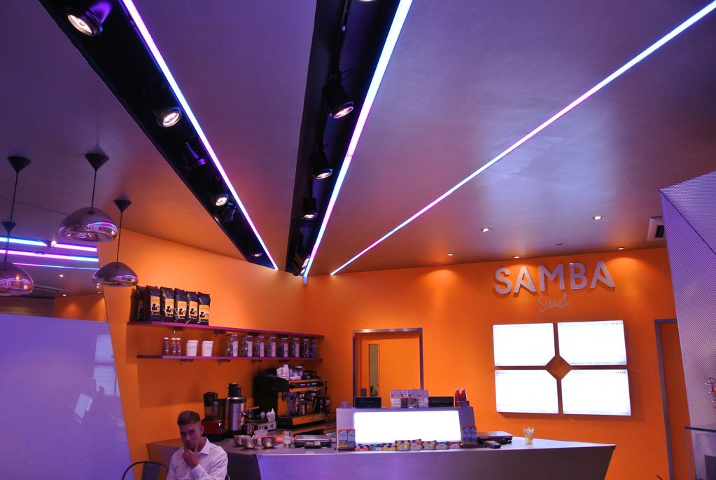 Samba Swirl wanted to bring an exciting up tempo, warm and welcoming vibe to the store and looked at the South American carnivals for their inspiration. The store features LED‘s in the walls, floor and ceiling, so as you enter the store light is pulsating everywhere that you look, creating a feeling of a store that is alive and breathing. As you read on through the article Mizzi Studios talks about how they worked with InStyle LED closely to help get the programming just right to allow the designers to animate the light at a very intricate level that has never been seen before on the high street in London.