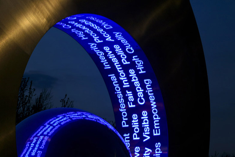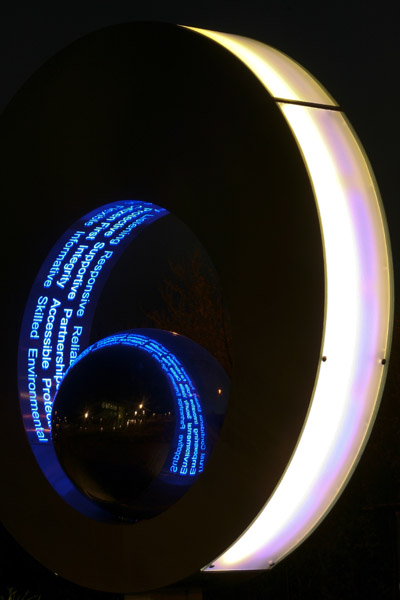 The Northumbria Force use a strap line of ‘Total Policing’ and suggested a circular piece encompassing all. The feature itself is made from polished stainless steel and curved glass. The inside of the large ring has a series of words cut out of the stainless steel to allow light to shine through onto the steel sphere in the centre of the feature.