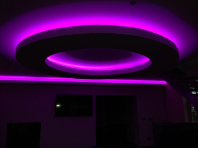 In this recent project the RGB LED strip lights were installed around the ceiling edge giving a smooth beam of light illuminating the room with a selected colour, setting a tone or mood for the room. As this installation used RGB lighting different colours can be selected from the primary colours Red, Green and Blue, but you can also select colours in between and even Warm White and Cool White.