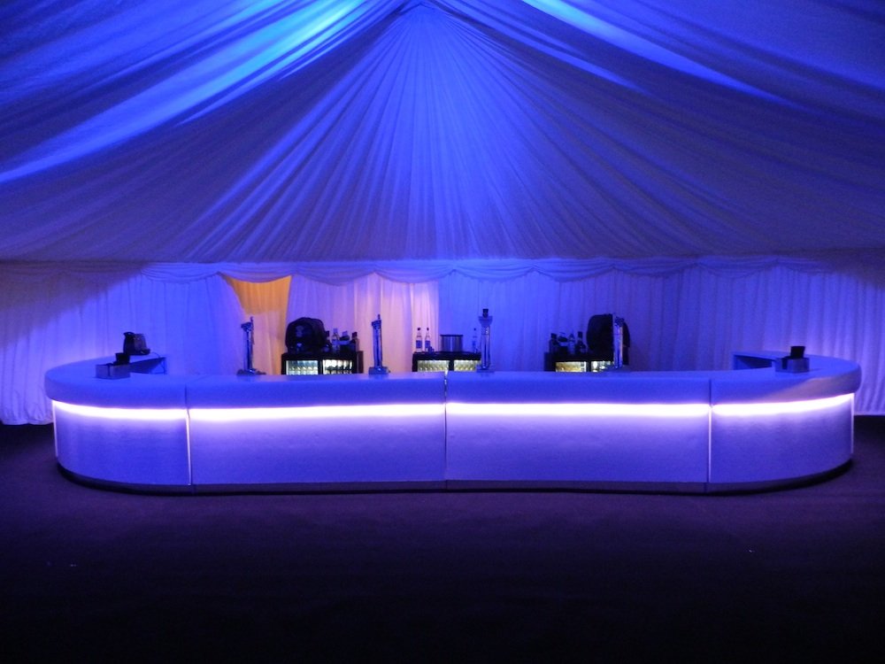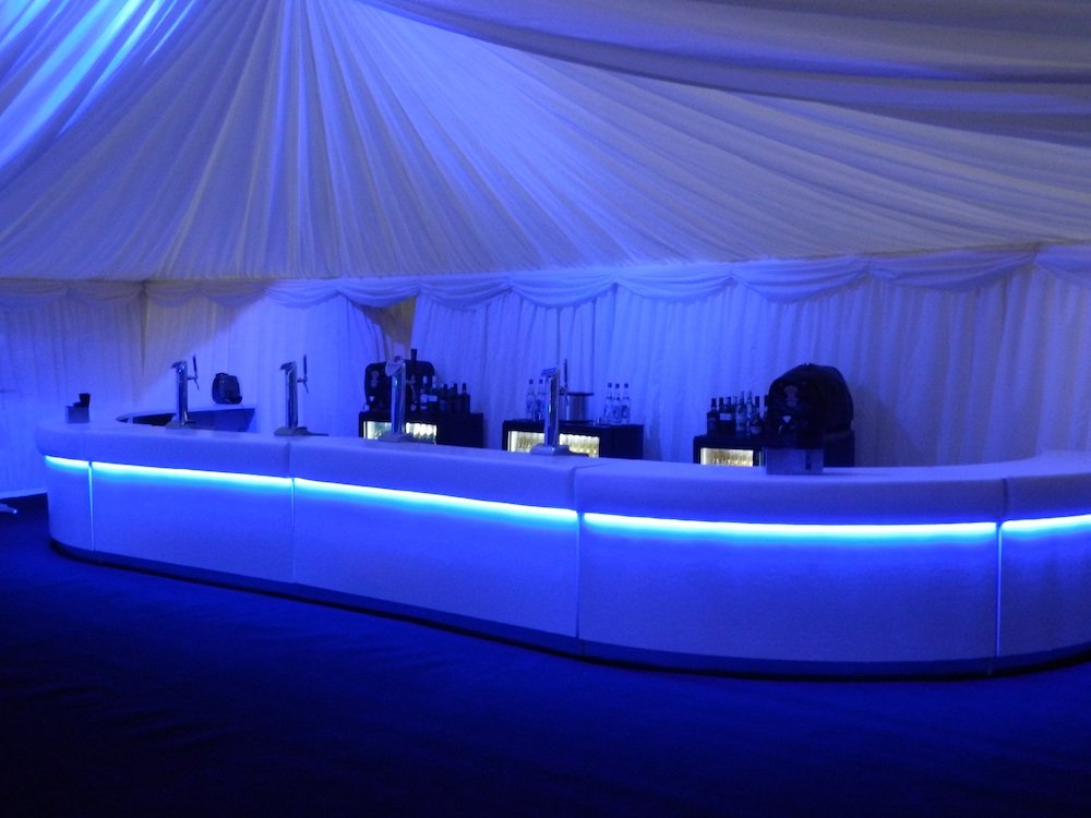 The above image is using colour changing RGB LED Tape using the blue setting. The LED Tape has been placed under the bar top so that the lights can shine down and illuminate the front of the bar. The LED Tape used is also IP67 waterproof as well to make sure that if any spillage happens over the time of use the LEDs won’t be affected by the liquid. The tape has a heat shrink cover over the LEDs which has been sealed at both ends to give it extra protection.