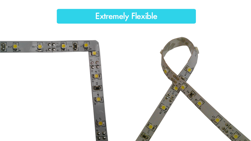 Being able to bend and twist the LED tape makes it far more superior than other forms of traditional lighting when it comes to flexibility It is a flexible PCB so it can bend back on itself and even fold round 90 degree corners without damaging the tape.