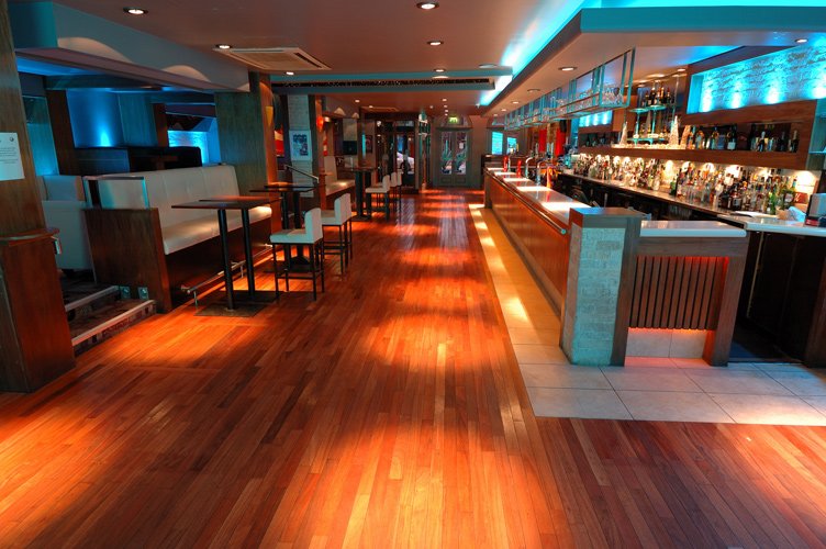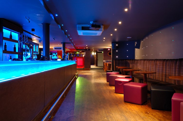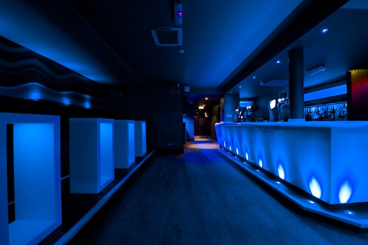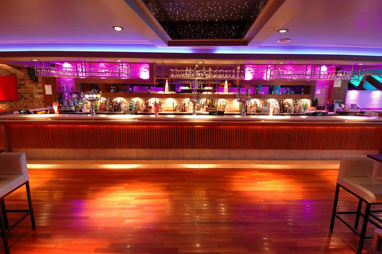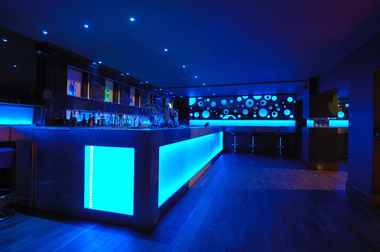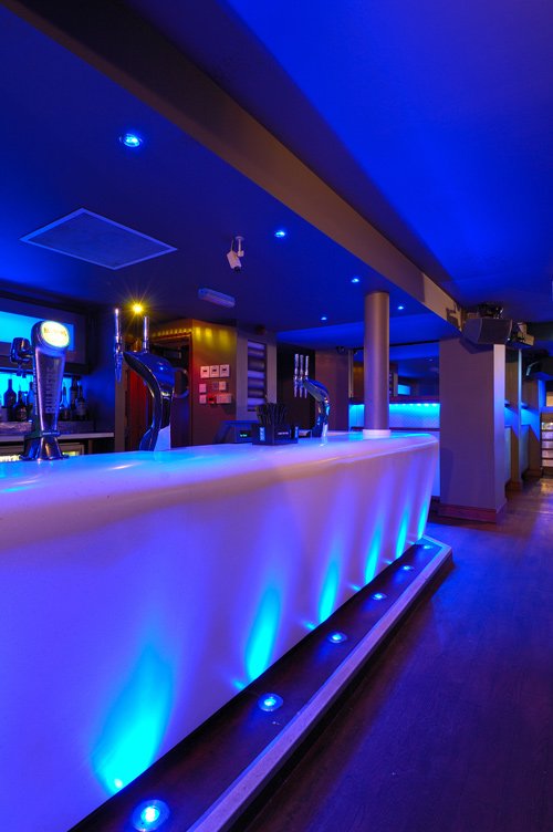 The Keys Nightclub in Yarm uses RGB downlights dotted around the ceiling and floor and strip lights along and inside the bar, helping make the bar very modern.