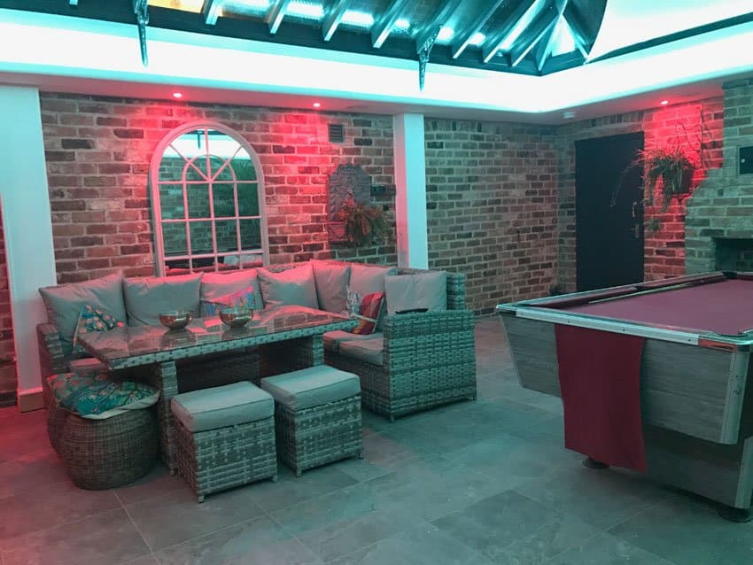 Here’s an excellent showcase for multizone LED colour-control lighting – an inspiring conservatory / jacuzzi project, lit by a combination of 10-watt and 20-watt RGBW LED strip lights (warm-white option).