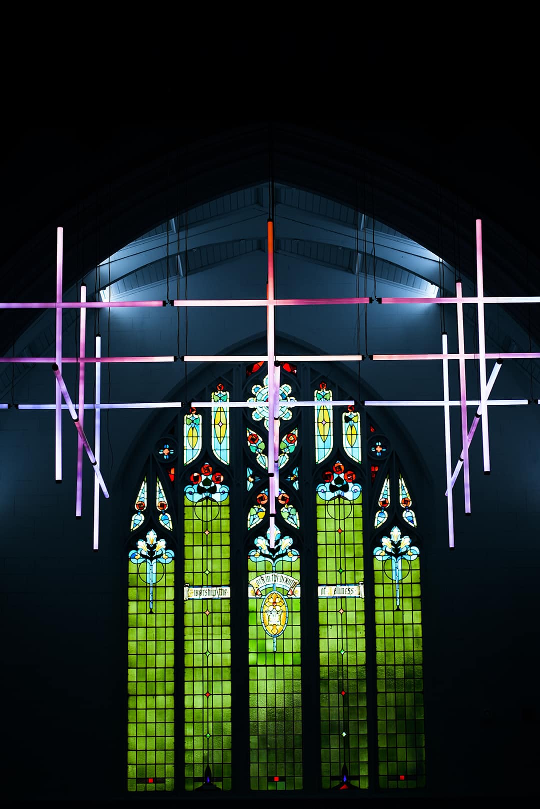 INSTYLE’s 360° LED tubes were suspended from the rafts in a crucifix style design. Floating perfectly, a modern day lighting twist in a historic church from the ages.