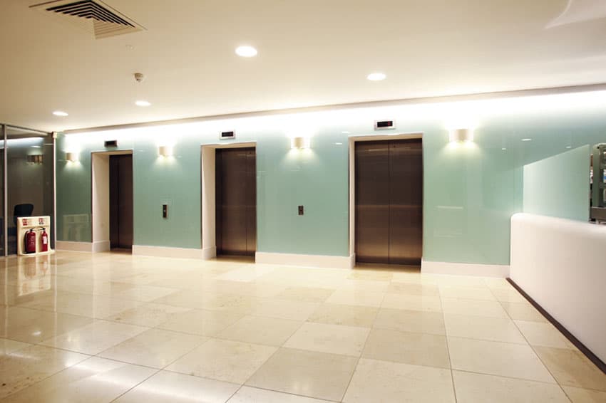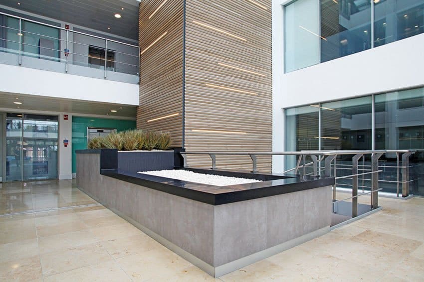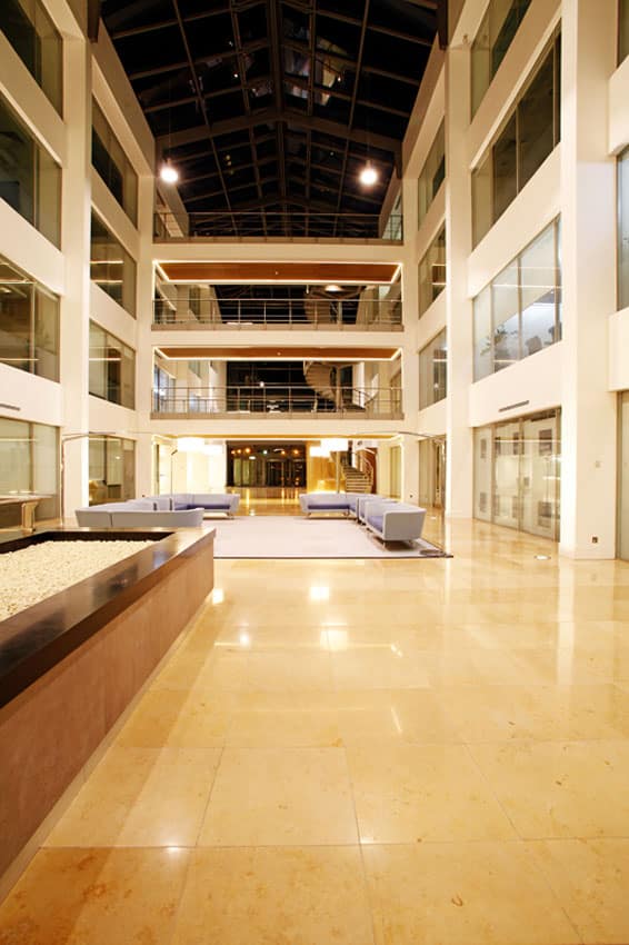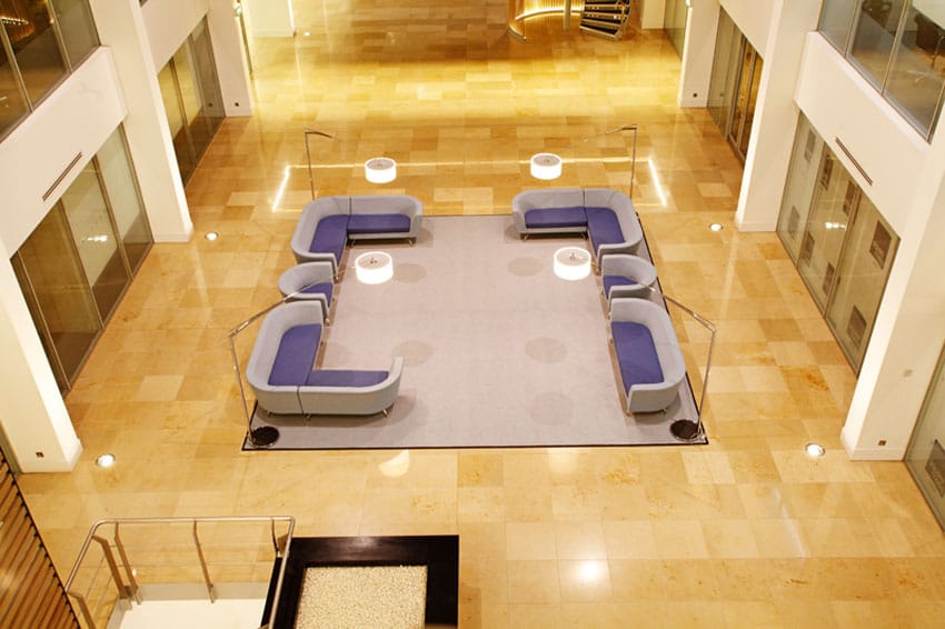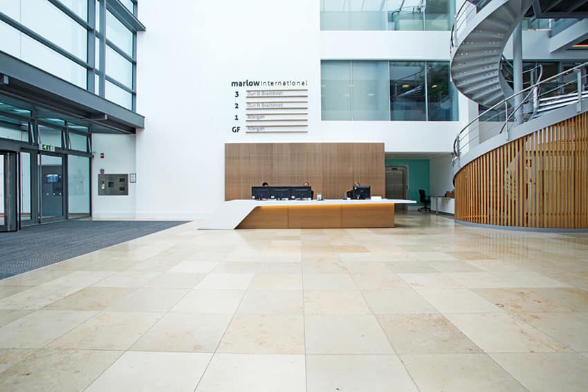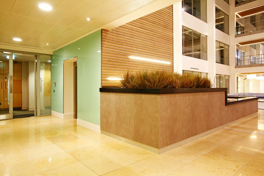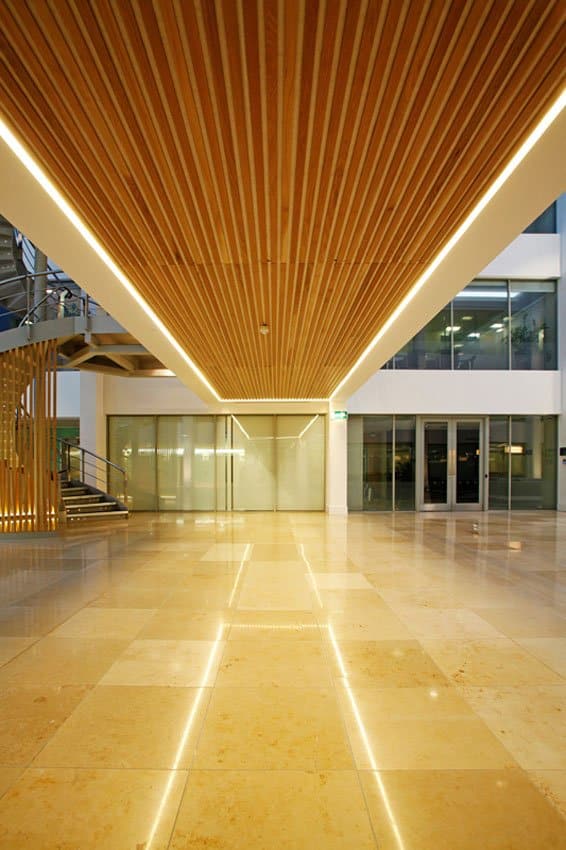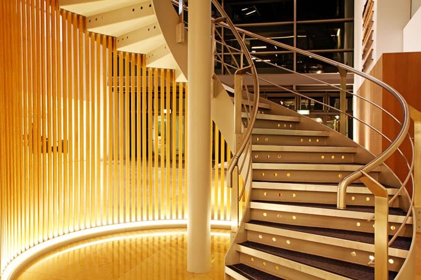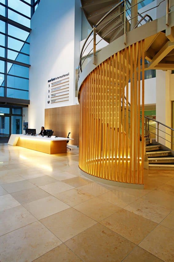 As well as the refurbished reception areas and lighting scheme, other features include raised floors throughout the office space. The central spiral staircase is highlighted by embedded spiral fossils in the entrance floors.