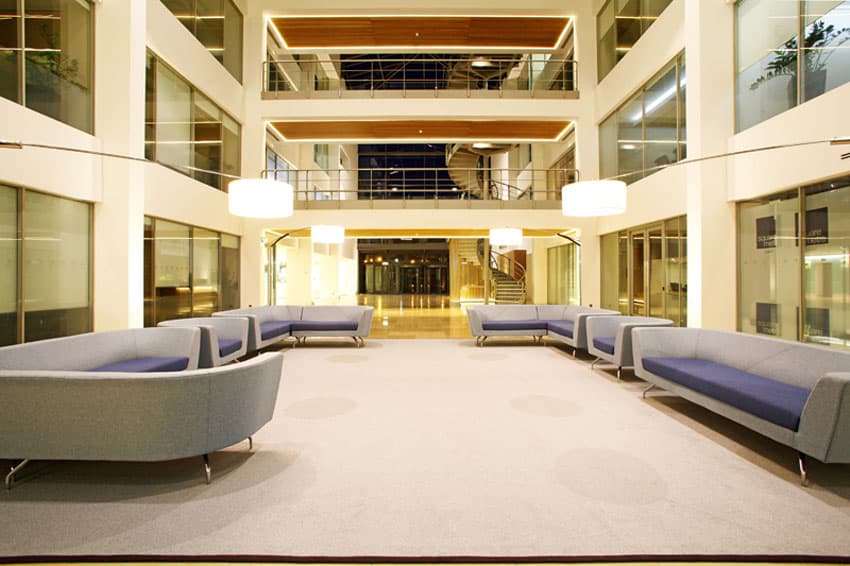 Outside, ASH enhanced the building’s appearance. Features include a soft-landscaped open space with sculptures, a dramatic flight of new external steps, and an avenue of semi-mature lime trees that provides access to the north car park.