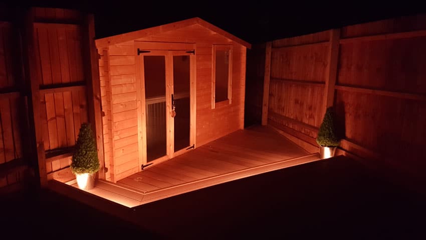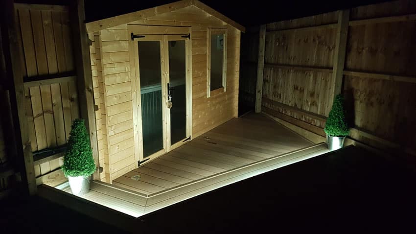 InStyle’s waterproof LED strip lights create a brilliant night-time effect around this garden cabin