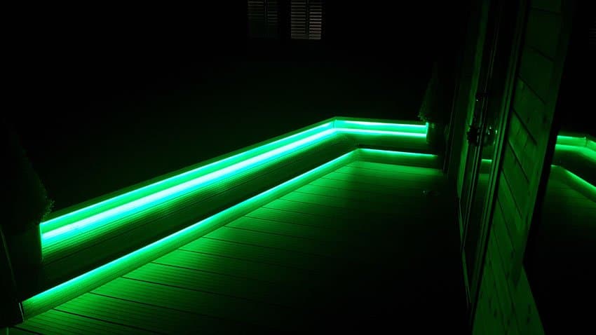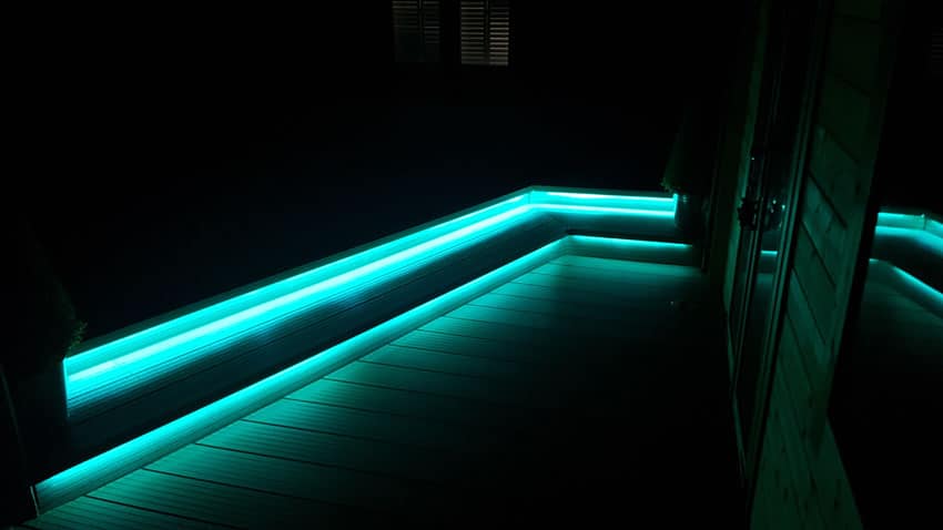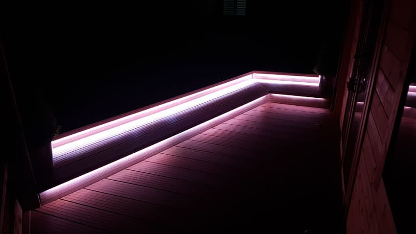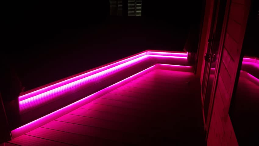 Housing a full-size hot tub, the timber cabin is lit inside and out by 8 metres of powerful 20-watt RGBW LED strip lights (4m for the interior, 4m outside). We supplied the LED tape pre-cut and soldered to the exact lengths required for the exterior steps and interior coving, then coated it all in plastic heatshrink with glue-sealed ends to provide IP67-rated waterproofing.