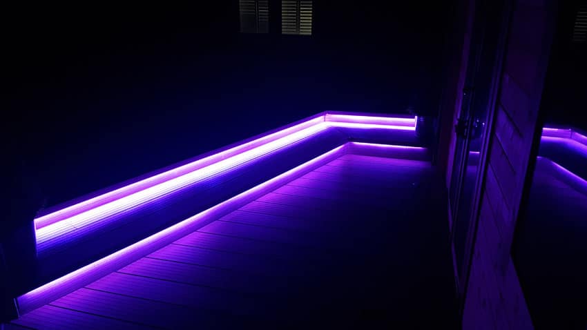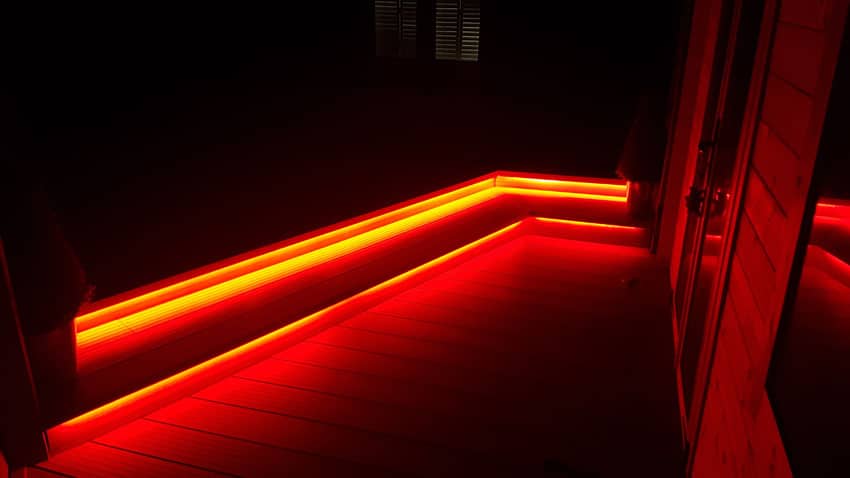 The outdoor LEDs are installed beneath the lip of the steps to the cabin. The diodes are downward-facing, in order to produce the smoothest colour-wash effect. Because the surrounding surfaces are all wood (i.e., textured), there’s no need to diffuse the the light to avoid glares and reflections.