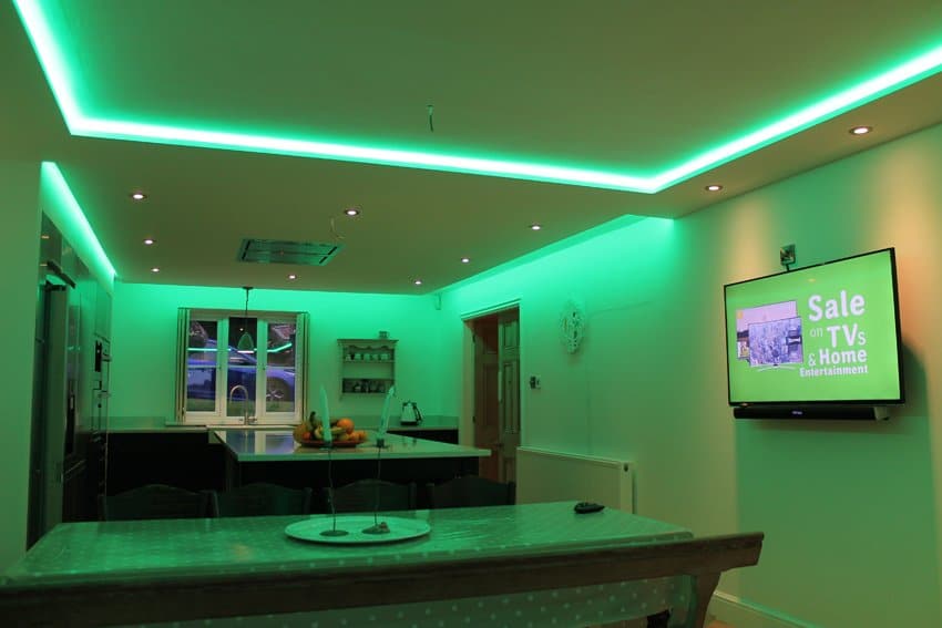 As you can see in the video above, the homeowner has fitted our LED tape as coving lighting, as well as making use of his kitchen’s existing drop ceiling. This makes the colour-changing RGBW strips a perfect complement for the room’s existing LED downlights.