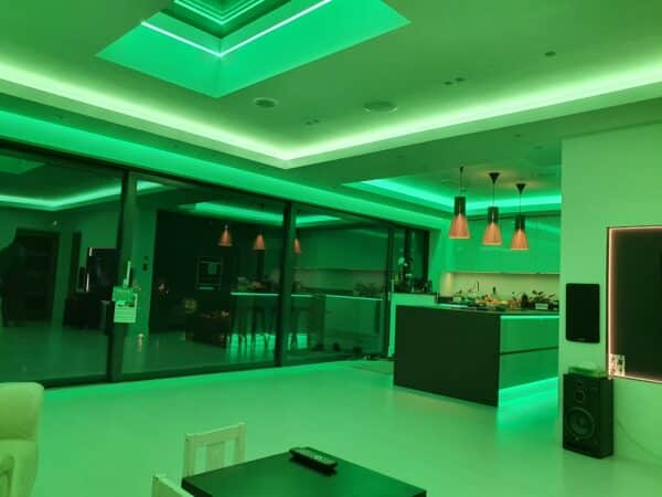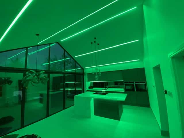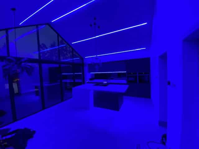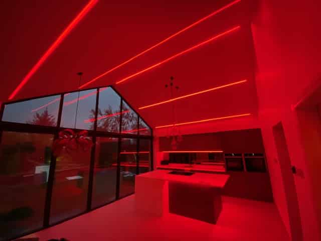 This beautiful, spacious kitchen interior is enhanced by a simple yet brilliantly effective lighting design by InStyle LED. Expansive walls and surfaces decorated in a crisp, clean white make an ideal backdrop for the endless lighting possibilities of smooth no-dot RGBW LEDs.