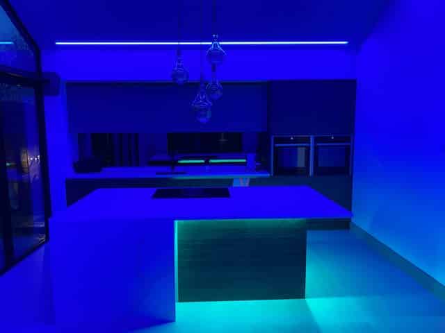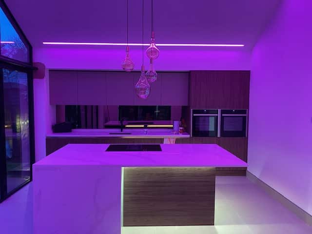 This wide-angle shot, showing the RGBW strips set to a cool white-light mix, displays the kitchen’s stunning design to fine effect.