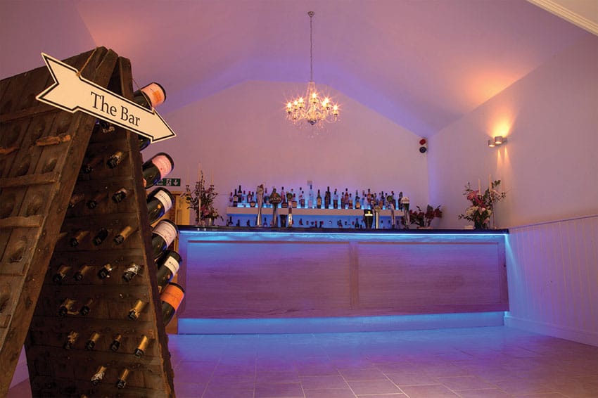 The LEDs create a unique ceiling light-wash effect, that can be colour-mixed to any shade at the touch of a button. The barn’s upper reaches are lit with beautiful colour, an ideal complement for the beautiful wedding venue.