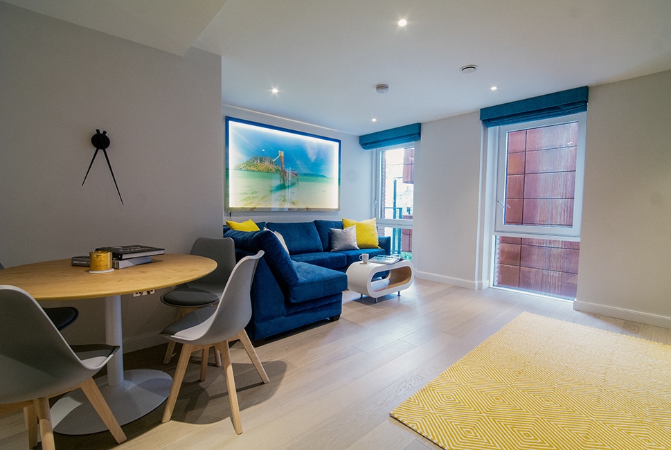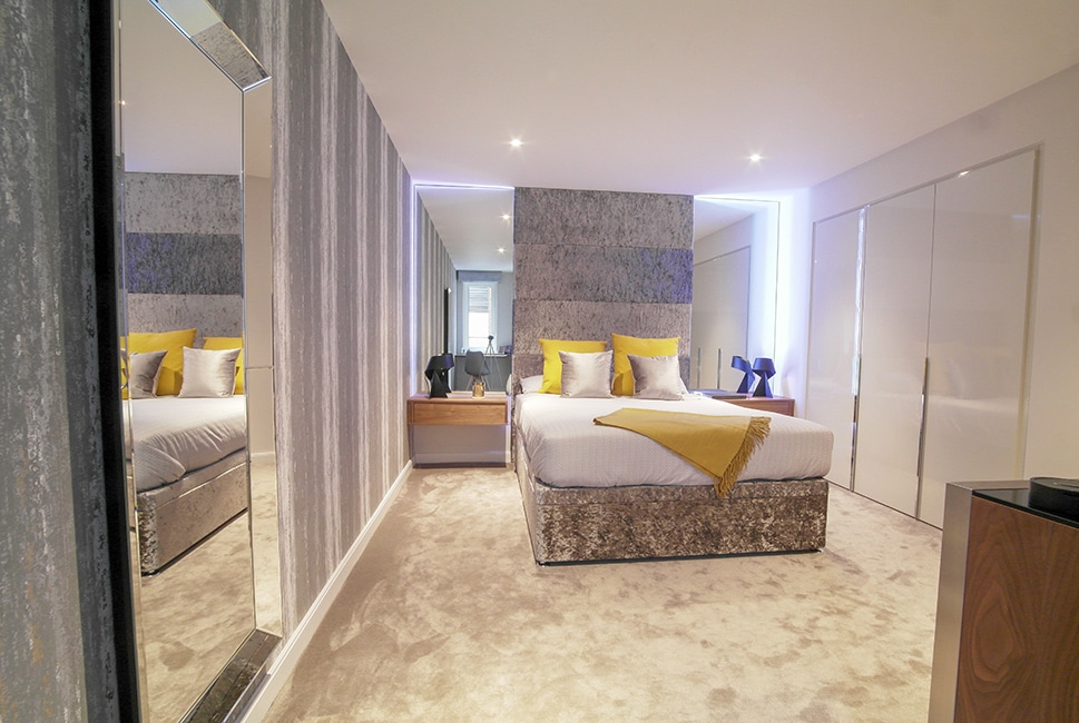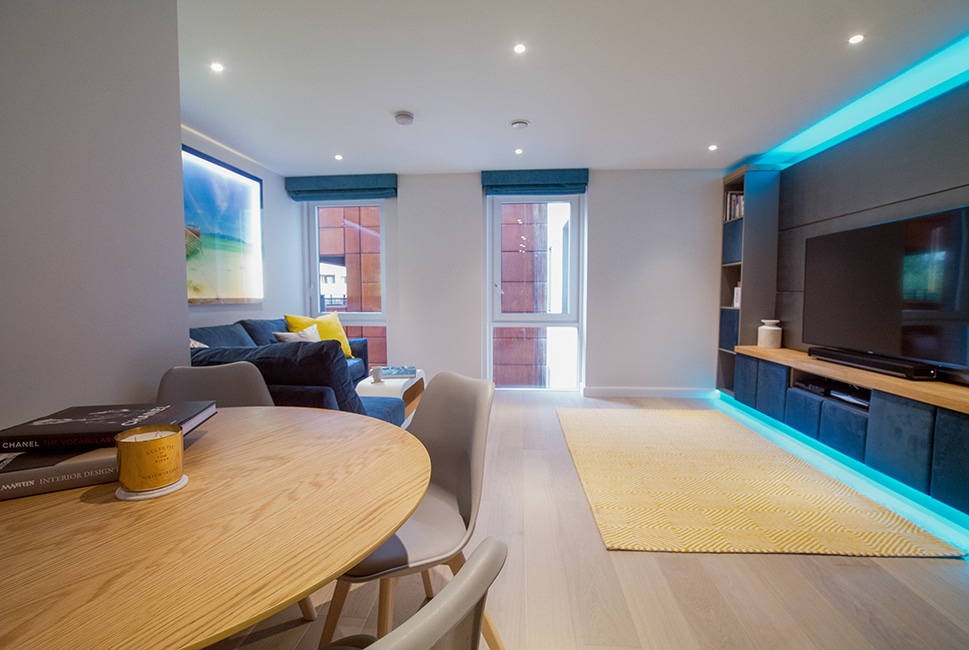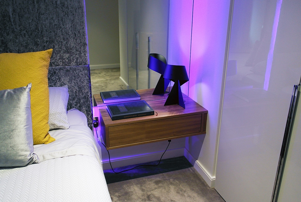 A playful yet sleek interior for this bachelor pad in a stunning new apartment block in Islington. Bespoke furniture and LED lighting by InStyle are feature objects that give the flat its individuality, while also providing on a practical level.