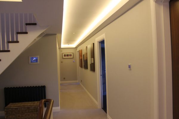 Coving-mounted LEDs can give enclosed spaces like this landing an even, warm tone.