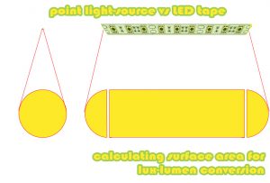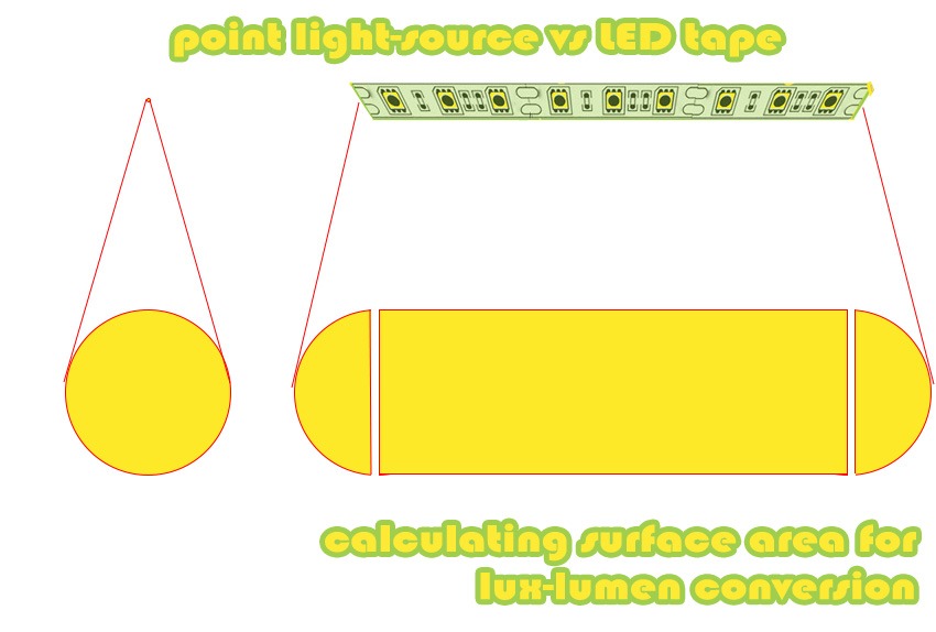 We calculate the area based on a length of tape, rather than a point. We approximate this by adding a rectangular area (equal to your LED strip’s tape-length x the diameter of an imaginary single-point source) to the circular single-point area calculation.
