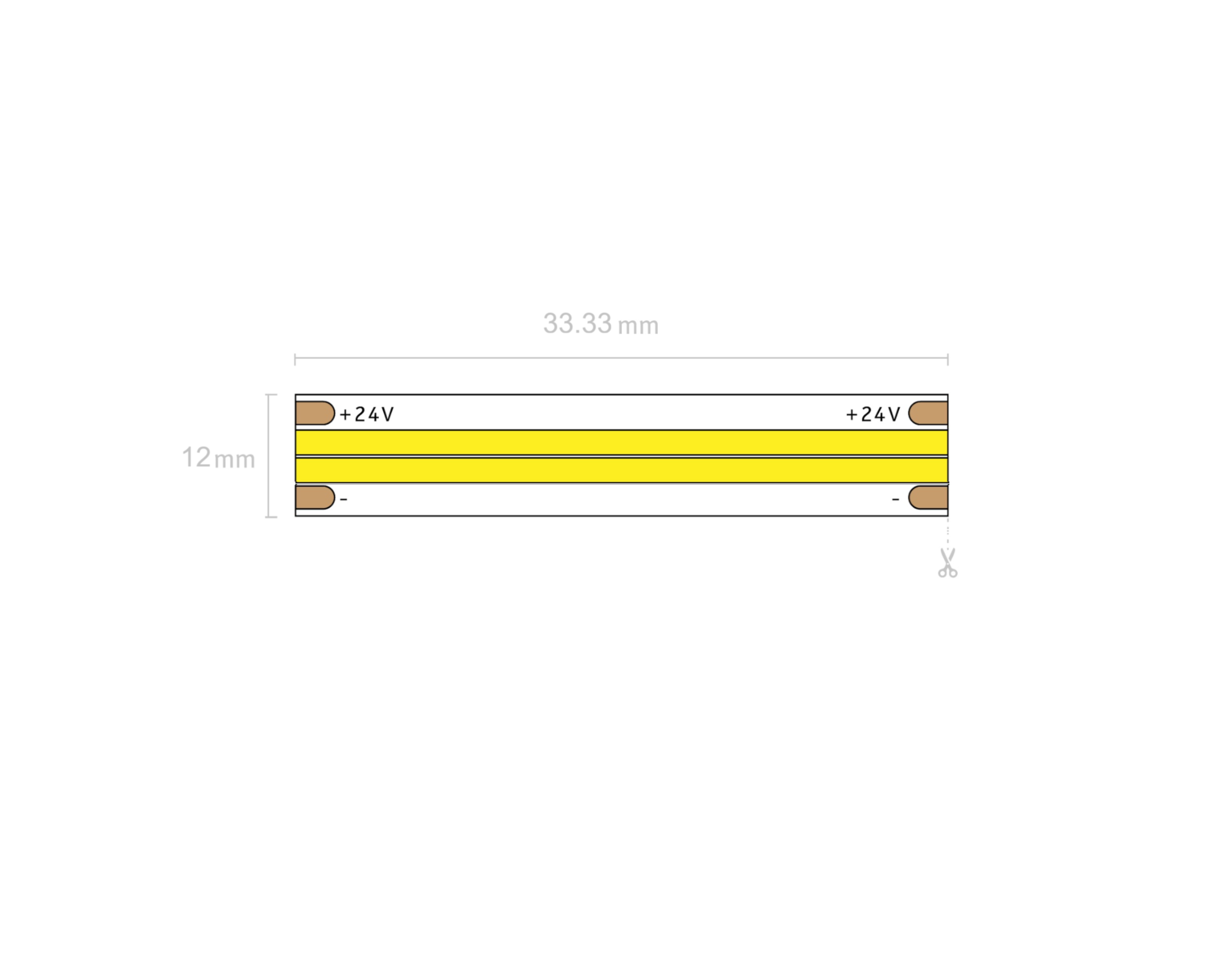 Available in 2700K, 3000K, 4000K, and 6000K, it suits both warm and neutral lighting schemes. Running on 24V allows longer installations, with up to 10m powered from one end. Cut points every 33mm enable precise installation, while the slim 12mm width fits standard profiles.