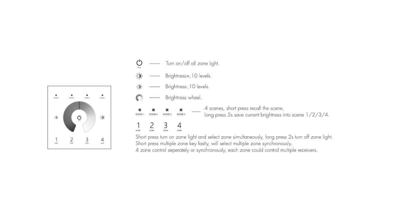 4 Zone LED dimmer uses a wireless signal to dim and raise lighting levels. The wall unit is a 4 Zone controller with an attractive white-glass finish. Each rocker-switch-style control can be linked to a separate lighting area, which can be dimmed independently or synchronised together – touch to turn on/off, and press up or down to adjust brightness. This wireless LED dimmer will require an LED receiver for each zone.