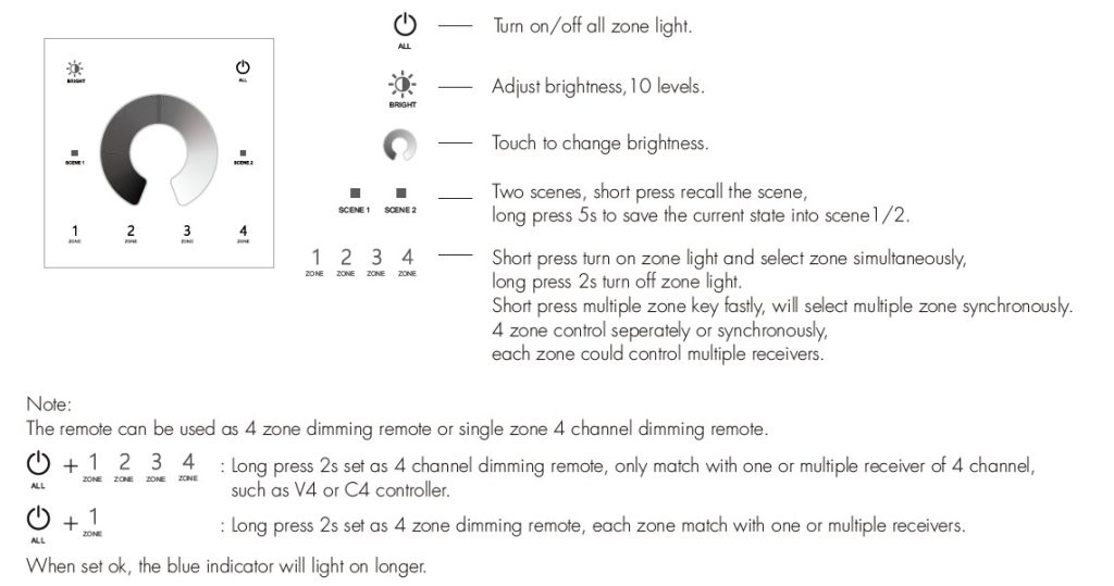 The wall plate allows smooth 0–100% dimming, so you can adjust brightness to suit any environment. With four independent zones, you can manage separate rooms or lighting areas individually, all from one sleek and compact controller.