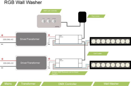 Our Power Driver 320 is essentially a ready-to-go installation kit. Once it’s in place, you’ll be able to control your lights via any DMX512 controller – this can be an simple-to-install, easy-to-use product like our wall controller (product details here), or you can use your own DMX controller from a laptop, or use a DMX desk, or one of many other options.