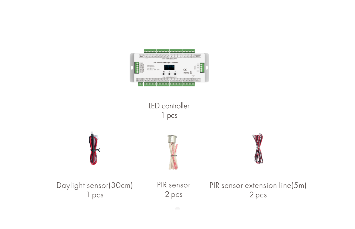Featuring up and down PIR sensors, a daylight sensor, and a cascade function, enables fully automated sequential lighting. Users can configure four lighting modes (White Step, Colour Flow, Colour Step, Step+Flow) with adjustable speed, brightness, and delay. The OLED display with 3-button control ensures easy setup, while built-in overheat, short-circuit protection, and self-testing guarantee reliability.