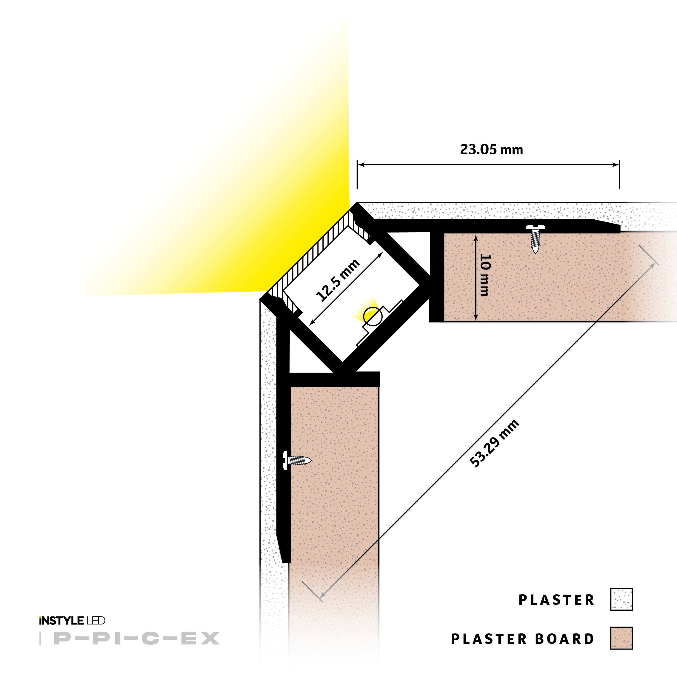 The INSTYLE LED Plaster-In Corner External LED profile is designed for seamless integration of LED strip lighting into plasterboard walls and ceilings at external angles. Manufactured from durable aluminium, it allows light to blend perfectly with architectural features, creating a clean and professional finish.