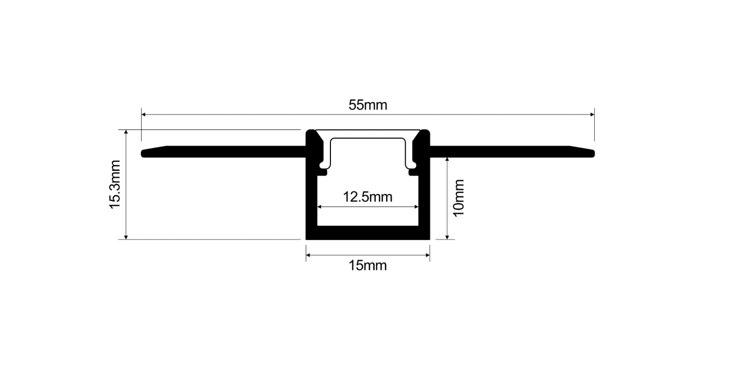 Measuring 15mm wide (55mm including flange) and 10mm high, this profile supports LED tape up to 12.5mm wide, making it ideal for slimline lighting designs. It is available in 1m and 2m lengths and finished in silver aluminium for a professional appearance.