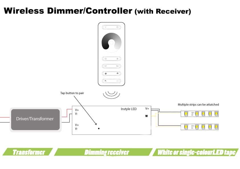 Suitable for white & single-colour LEDs 20m range, No ‘Line of Sight’ needed