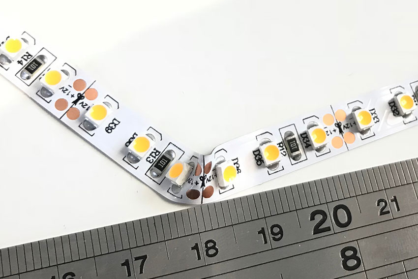 When we talk about ‘bending LED tapes laterally’, it means creating a curve of light on a flat surface (by bending the strip across the edge of the PCB). Like this: