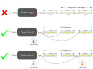 So if, for example, you have joined 2 x 5m strips together and powered them from one end and the strip is less bright towards the end, then you should either: (A) spit the strip up and wire the 2 x 5m strips in parallel, or (B) wire in a ring main with a starter lead and exit lead on the 10m and wire both cables back to the one power supply, as shown below.